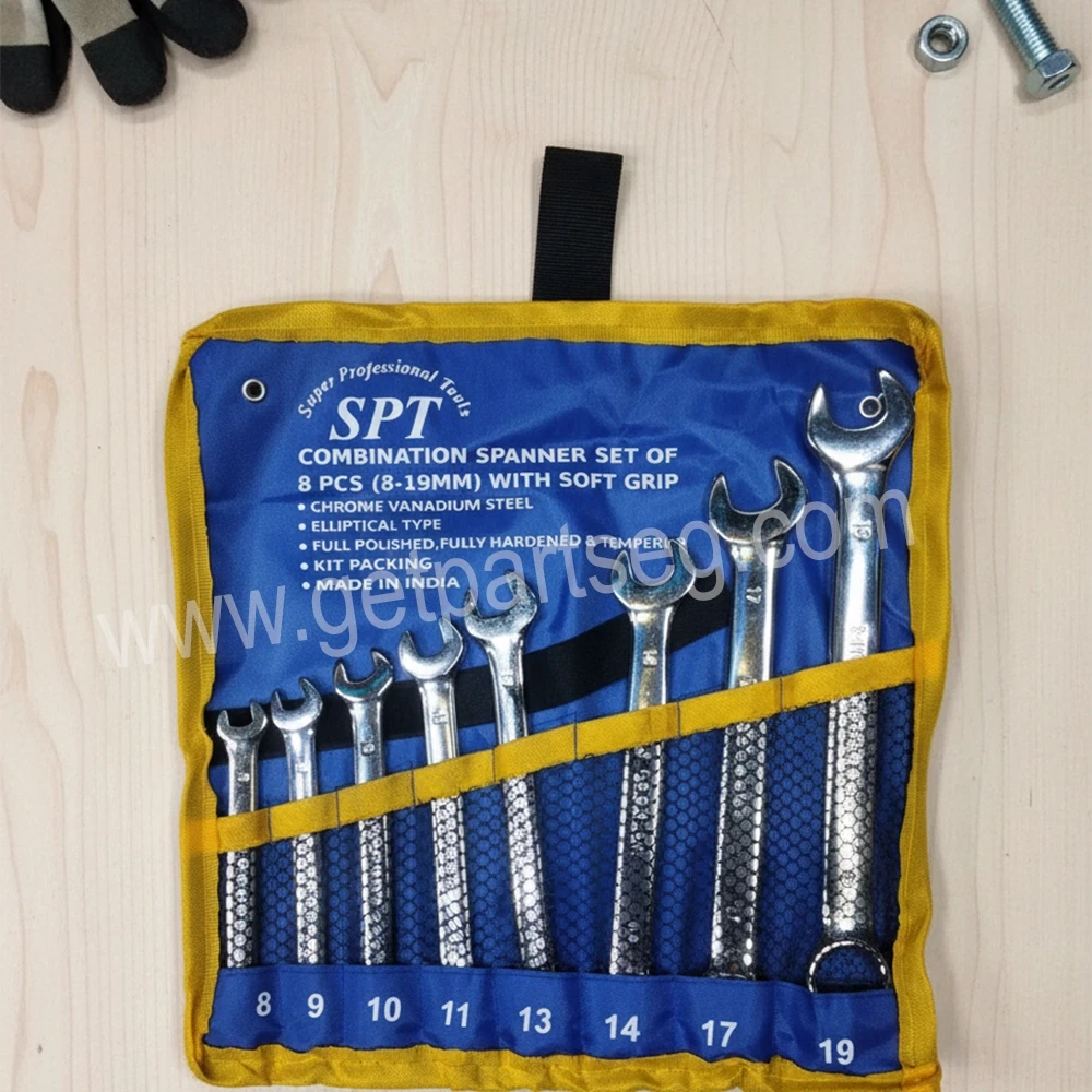 طقم مفاتيح مشترك SPT هو مجموعة احترافية مكونة من 8 قطع مقاسات (8-19 مم)، مثالي لأعمال صيانة السيارات والدراجات والاستخدامات المنزلية والورش. تم تصنيع المفاتيح من فولاذ كروم فانديم عالي الجودة ليمنحك المتانة والقوة في الاستخدام لفترات طويلة، مع تشطيب مصقول بالكامل للحماية من الصدأ والتآكل. يتميز التصميم البيضاوي للمفاتيح بسهولة الحمل والتحكم، كما يأتي الطقم في شنطة عملية أنيقة لسهولة النقل والتخزين. تشمل المجموعة المقاسات الأكثر شيوعًا (8، 9، 10، 11، 13، 14، 17، 19 مم) لتناسب مختلف الاحتياجات والفك والتركيب في أصعب الظروف. منتج مثالي للمحترفين والهواة على حد سواء ويعد من أدوات الورشة الأساسية لأي فني أو مستخدم منزلي يبحث عن الجودة والعملية.